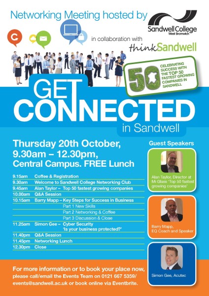 Sandwell College, in collaboration with Think Sandwell, is pleased to announce its next 'Get Connected in Sandwell' networking meeting on Thursday 20 October from 9.30am to 12.30pm at Central Campus.